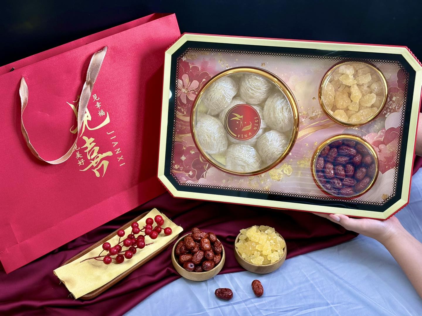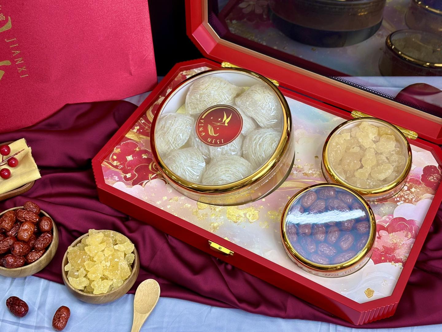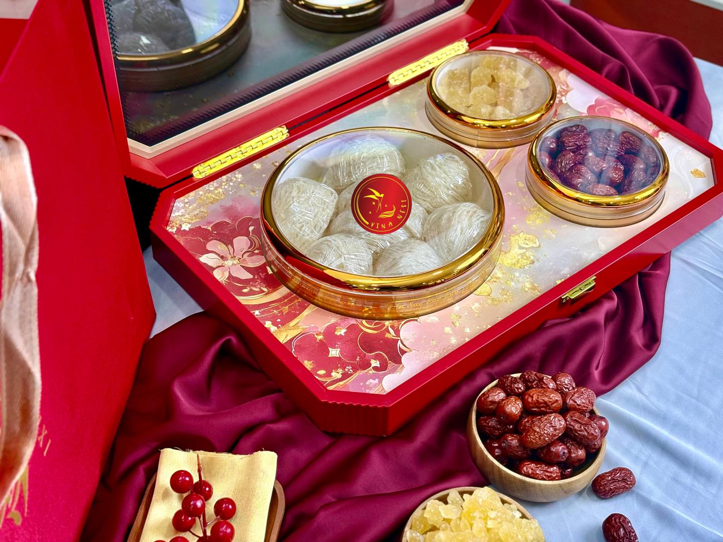 • Hộp thiết kế sang trọng – tông đỏ & vàng hoàng gia